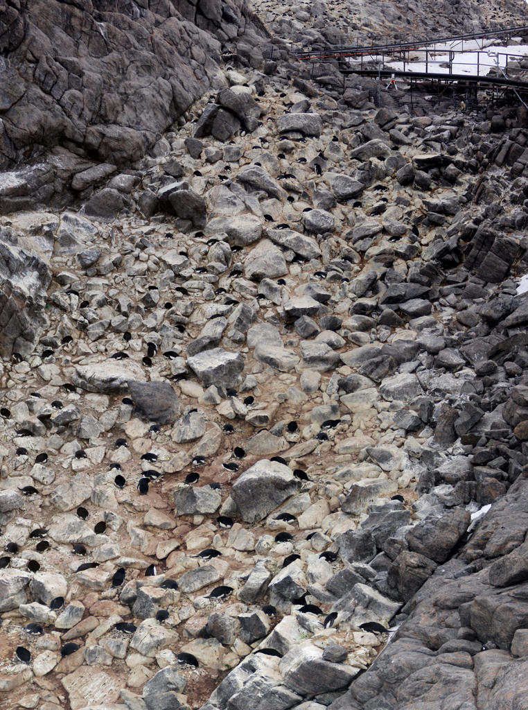 The Adélie penguin colony at Dumont d'Urville station is closely monitored by ornithologists. Each summer the equipment is redeployed. It consists of cameras, RFID chip detection antennas on the penguins' feet, and automatic weighing platforms.