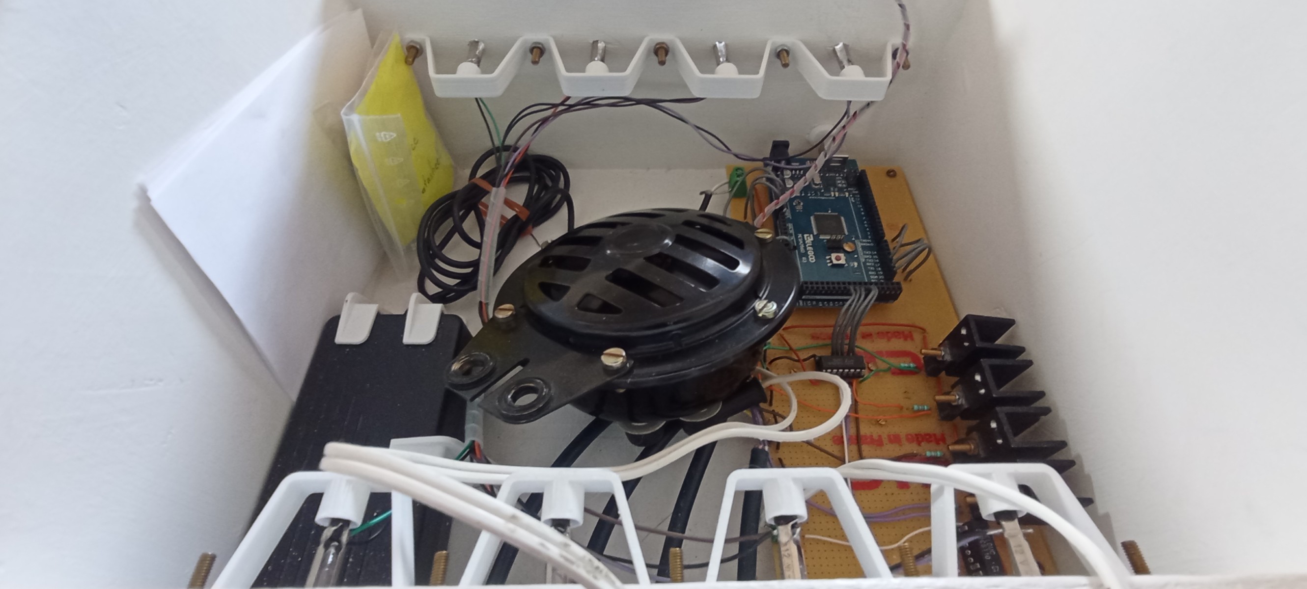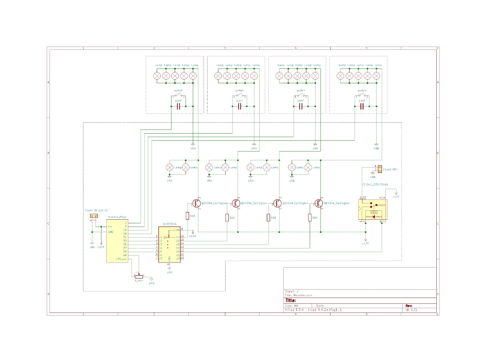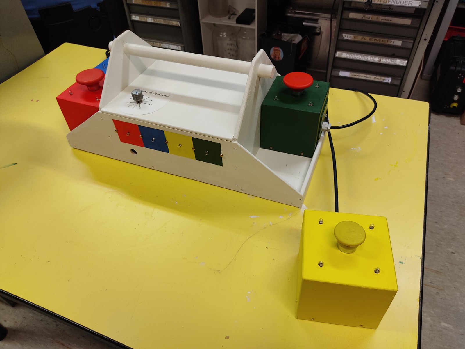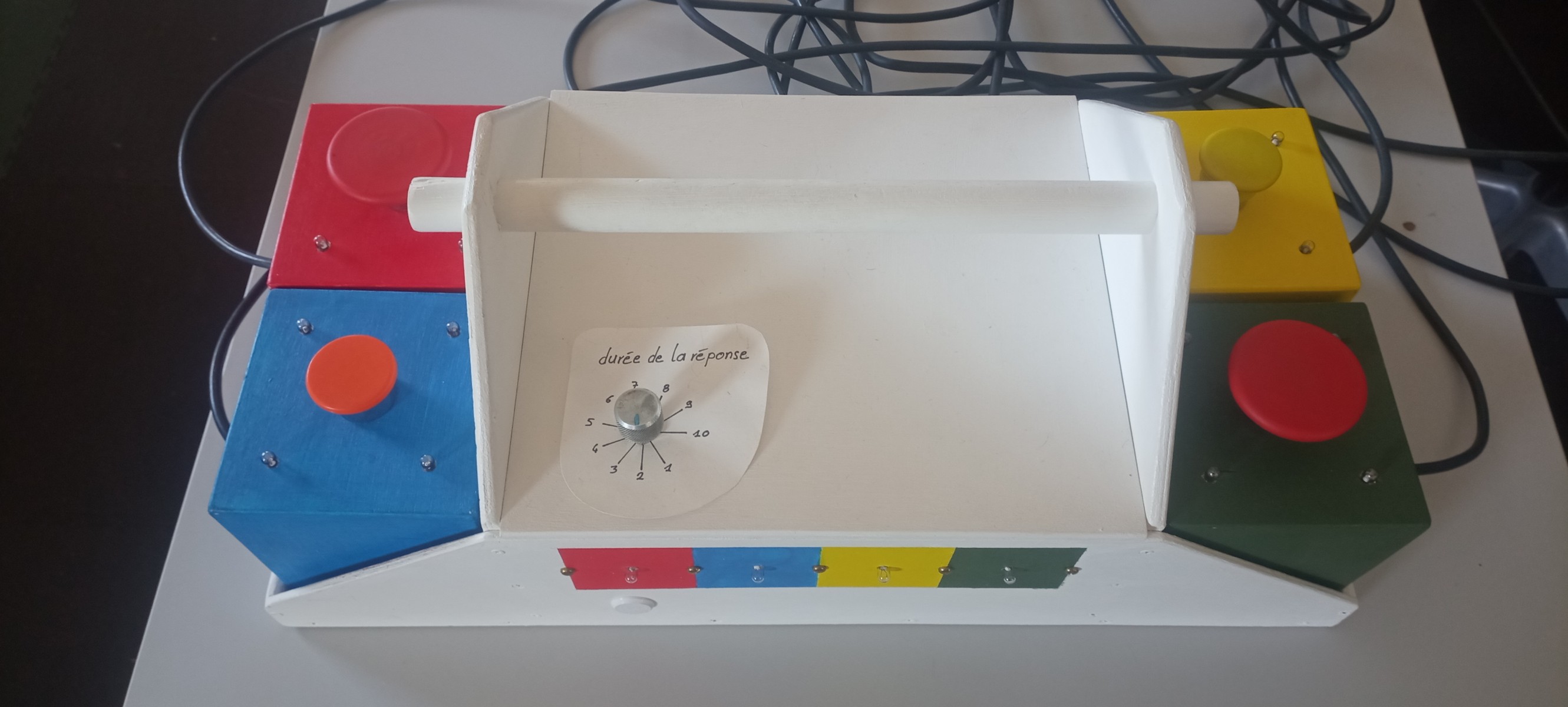 The system consists of four buzzers connected to a central box containing a siren. A potentiometer allows adjusting the delay between two responses to accommodate different games that can be imagined. Lights are placed on both the buzzers and the central box.