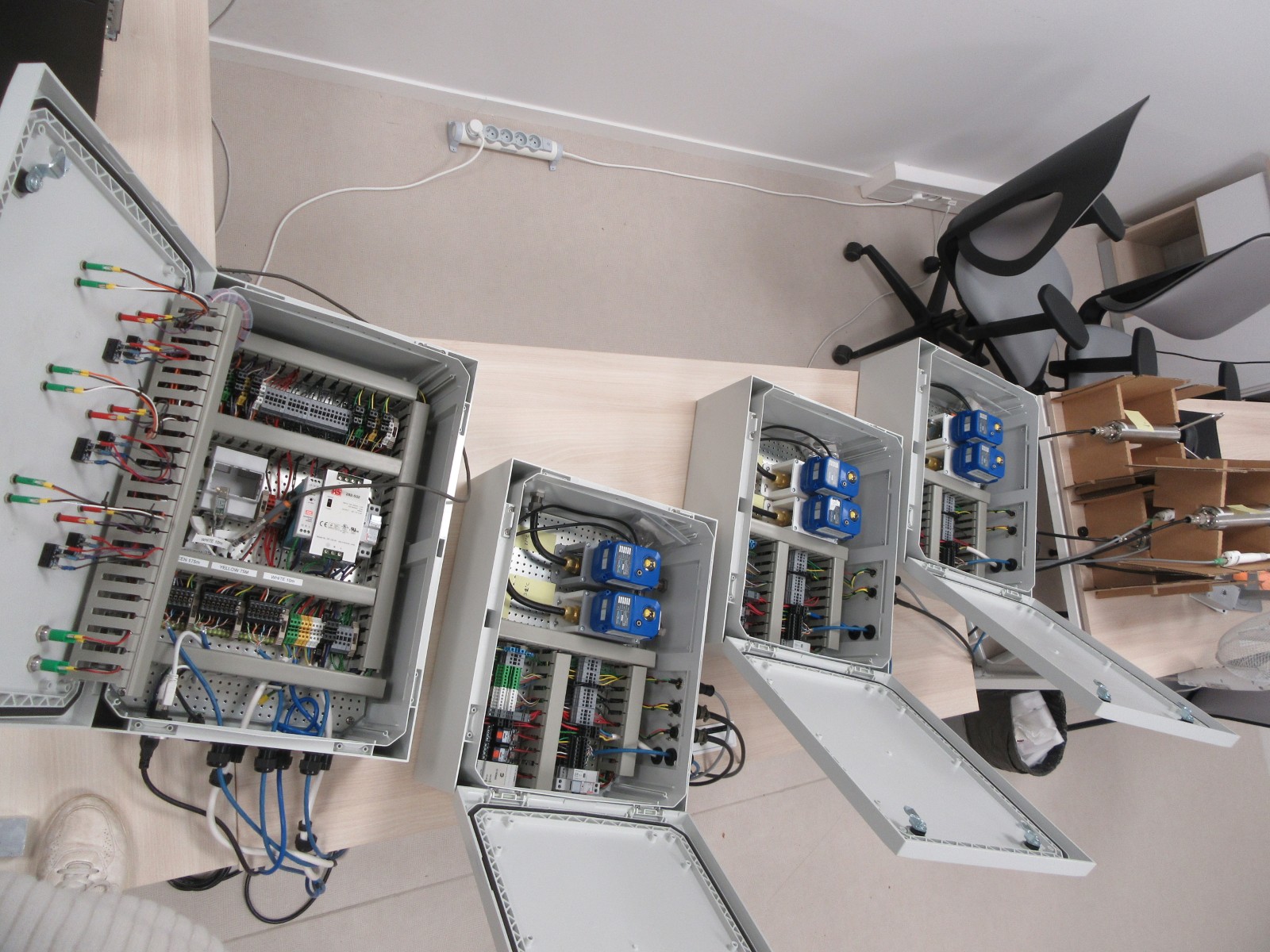 Interior of the electrical control box and one of the three boxes on the tower that integrate the solenoid valves and interface the sensors: