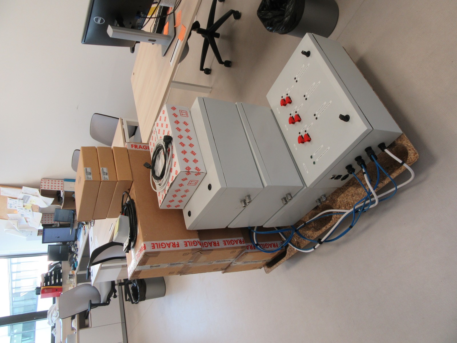 Wired system ready to be delivered on site. The pallet contains the four electrical boxes and the meteorological sensors in their cartons: