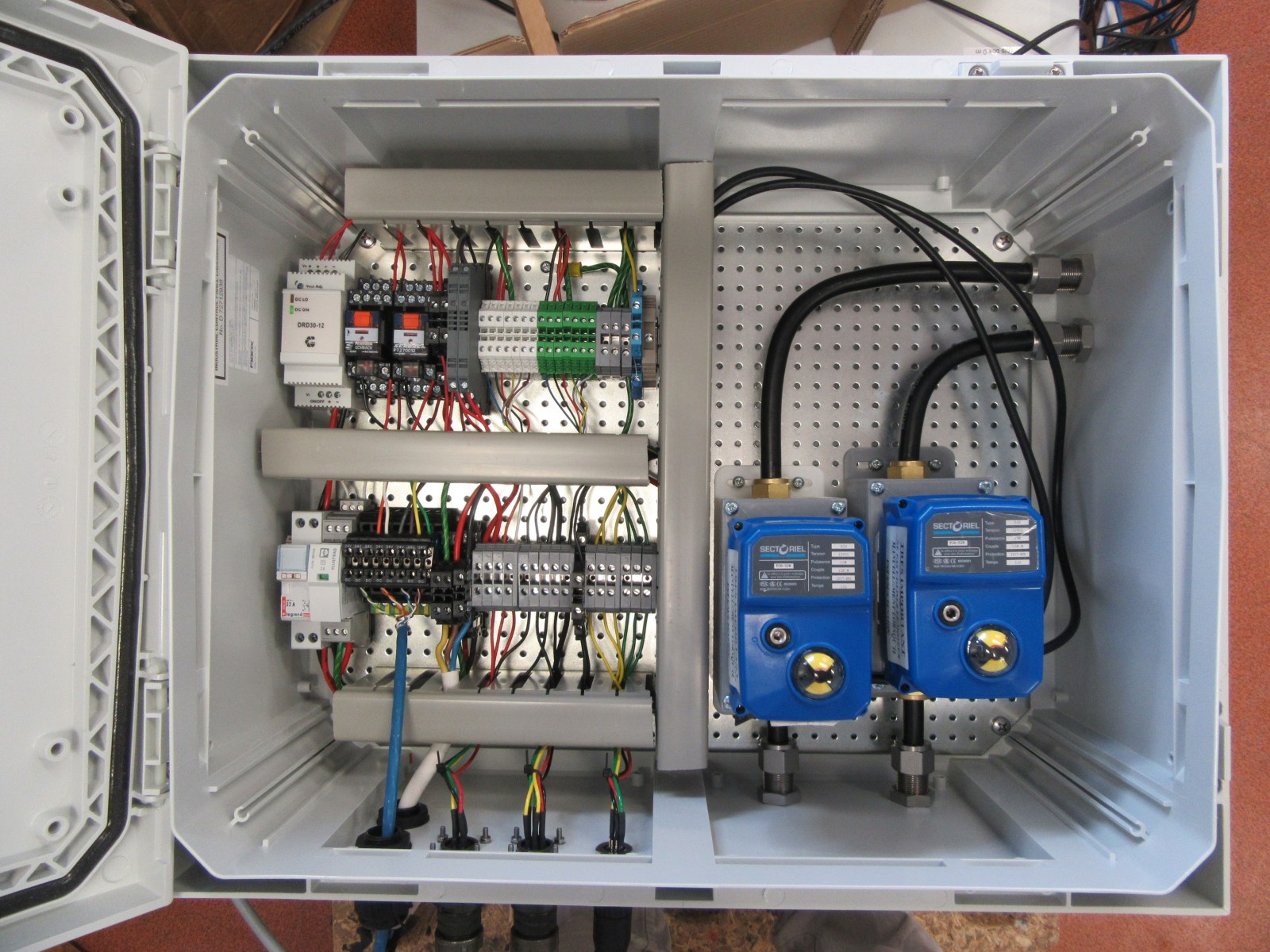 Intérieur du boîtier électrique de commande et de l'un des trois boîtiers qui sur la tour intègrent les électrovannes et interfacent les capteurs :