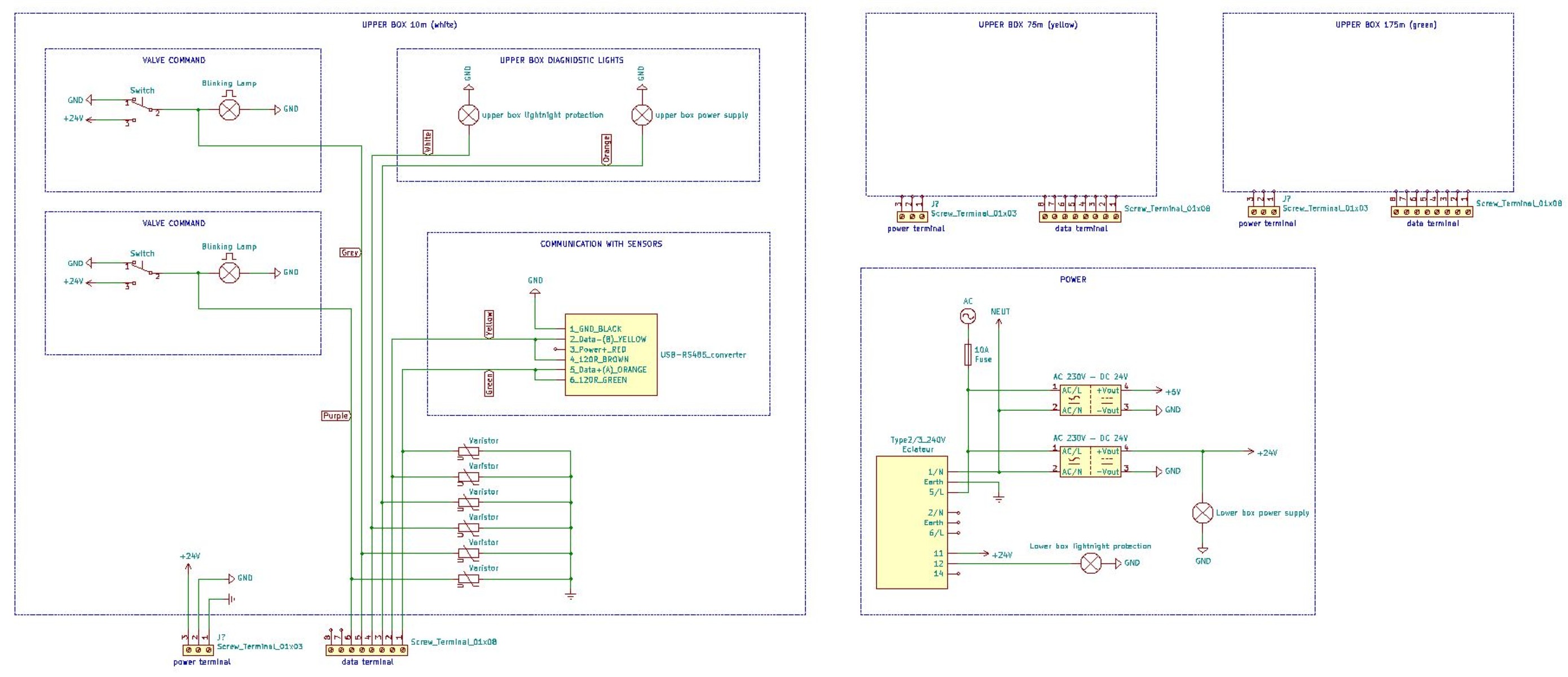 Inneres des elektrischen Steuerungskastens und eines der drei Kästen auf dem Turm, die die Magnetventile integrieren und die Sensoren verbinden: